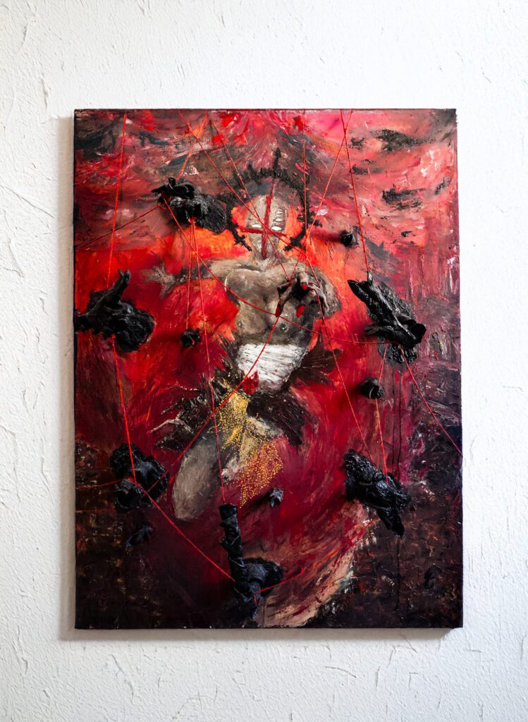 A força emocional da coleção ganha vida através de uma técnica deliberadamente intensa. As telas são construídas com uma pintura em impasto, aplicada com espátulas em movimentos que criam relevos densos e dramáticos. A superfície da pintura não é plana; ela respira, sangra, existe com uma tridimensionalidade quase escultórica.